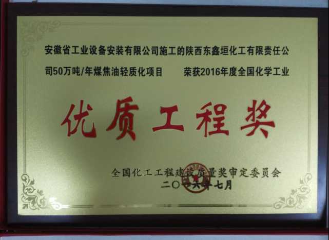 近日,從全國化學(xué)工程建設質(zhì)獎審定委員會(huì )傳來(lái)喜訊,公司參建的陜西東鑫垣化工有限責任公司50萬(wàn)噸/年煤焦油輕質(zhì)化項目榮獲“2016年度全國化學(xué)工業(yè)優(yōu)質(zhì)工程獎”。