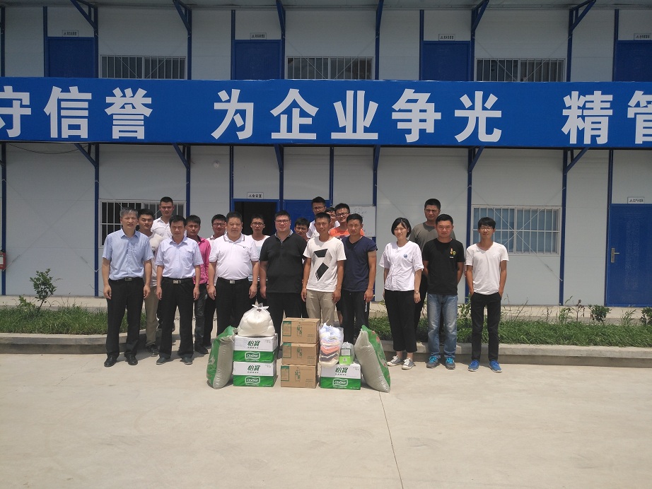 烈日炎炎,熱浪滾滾。連日來(lái),淮北氣溫節節攀升,7月22日正值大暑時(shí)節,公司董事長(cháng)、總經(jīng)理王軍邦,紀委書(shū)記、工會(huì )主席李寬旭,總工程師吳繼成一行,來(lái)到淮北和諧新家園項目部“送清涼”,親手將一袋袋綠豆,一條條毛巾,一盒盒仁丹、清涼油,一箱箱礦泉水等防暑降溫物品,送到頂著(zhù)高溫,堅守在生產(chǎn)崗位的項目員工手中,給奮戰在一線(xiàn)的員工們送上沁人心脾的絲絲涼爽和無(wú)微不至的親切關(guān)懷。