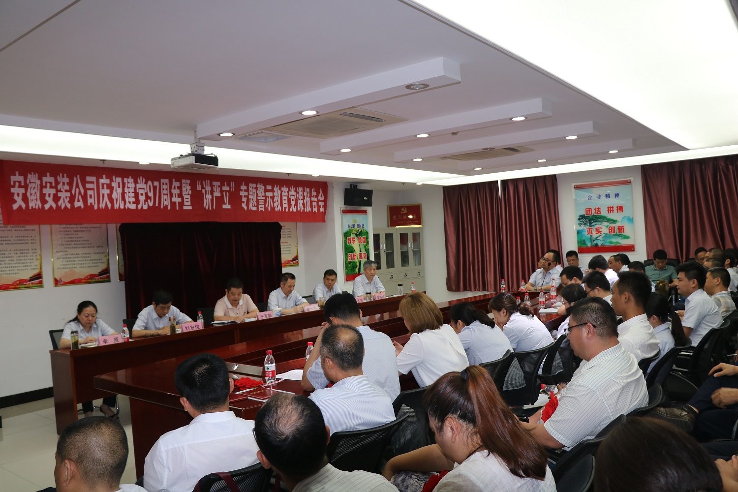 為慶祝中國共產(chǎn)黨建黨97周年,扎實(shí)開(kāi)展好“講忠誠、嚴紀律、立政德”專(zhuān)題警示教育,推動(dòng)全面從嚴治黨向縱深發(fā)展。7月4日下午,安徽安裝公司黨委召開(kāi)慶祝建黨97周年暨“講嚴立”專(zhuān)題警示教育黨課報告會(huì )。公司黨委書(shū)記、副總經(jīng)理胡六中作了題為《講忠誠 嚴紀律 立政德 做新時(shí)代合格共產(chǎn)黨員》的黨課報告。公司董事長(cháng)、總經(jīng)理、黨委副書(shū)記王軍邦主持會(huì )議并宣貫集團公司慶祝建黨97周年暨黨的建設工作會(huì )議精神。黨委委員、副總經(jīng)理劉安俊宣讀表彰決定。公司領(lǐng)導班子成員、機關(guān)部門(mén)正副職、機關(guān)在崗黨員、分公司領(lǐng)導班子成員和受表彰的先進(jìn)基層黨組織、優(yōu)秀共產(chǎn)黨員和優(yōu)秀黨務(wù)工作者共70余人參加會(huì )議。