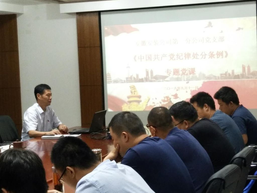 9月11日,第一分公司黨支部開(kāi)展“黨支部書(shū)記上黨課”主題黨日活動(dòng)。分公司黨支部書(shū)記胡迎東以新修訂的《中國共產(chǎn)黨紀律處分條例》為主題,采用PPT的形式為全體黨員、分公司領(lǐng)導班子成員、機關(guān)部門(mén)負責人、在肥項目經(jīng)理上了一堂生動(dòng)的黨課。