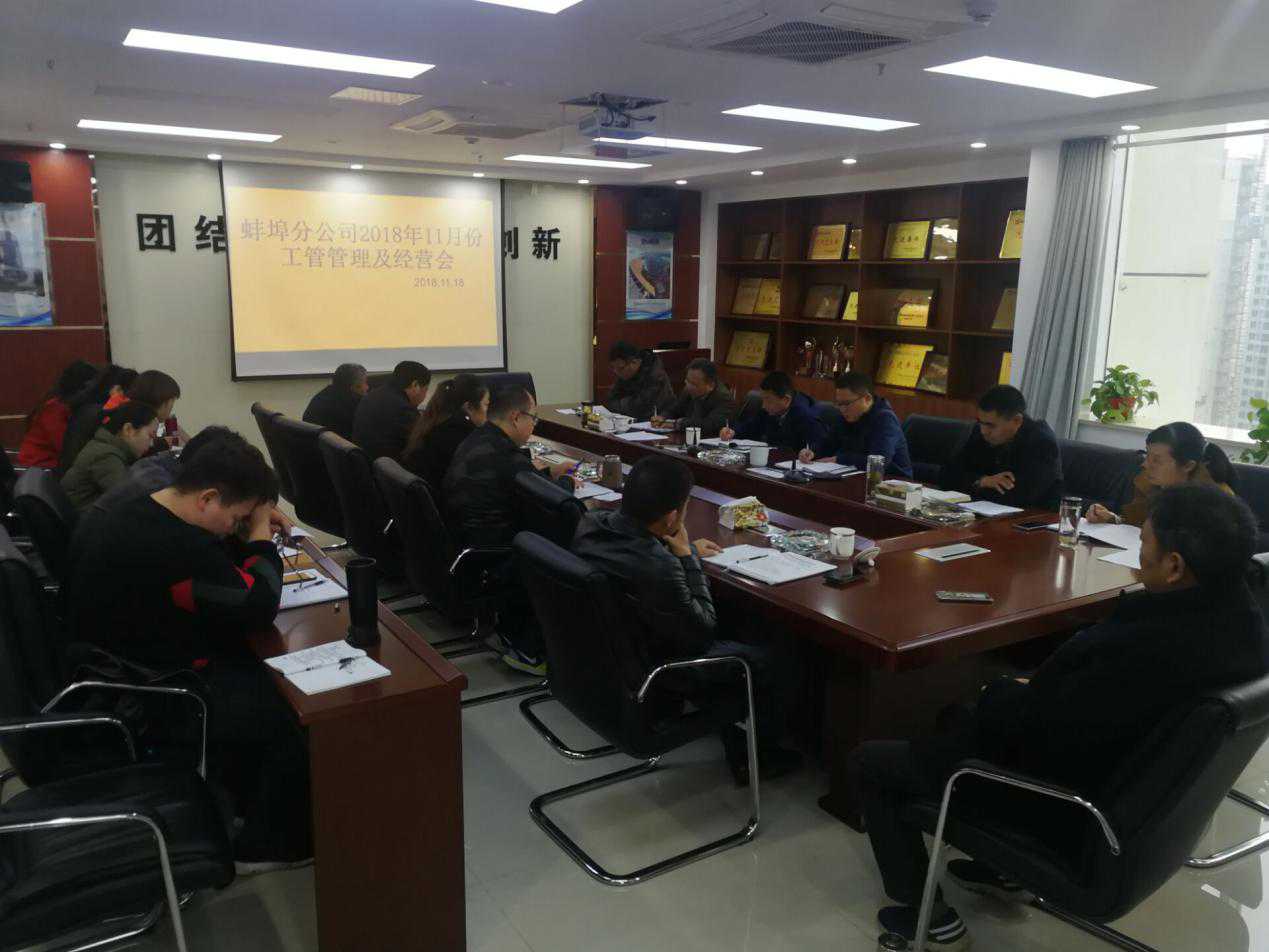 2018年11月18日下午,在蚌埠分公司會(huì )議室召開(kāi)11月份工程管理及經(jīng)營(yíng)工作會(huì )議。分公司領(lǐng)導班子成員、機關(guān)各部門(mén)負責人及項目經(jīng)理、聯(lián)營(yíng)合作單位負責人參加會(huì )議,會(huì )議由分公司副經(jīng)理張漢軍主持。