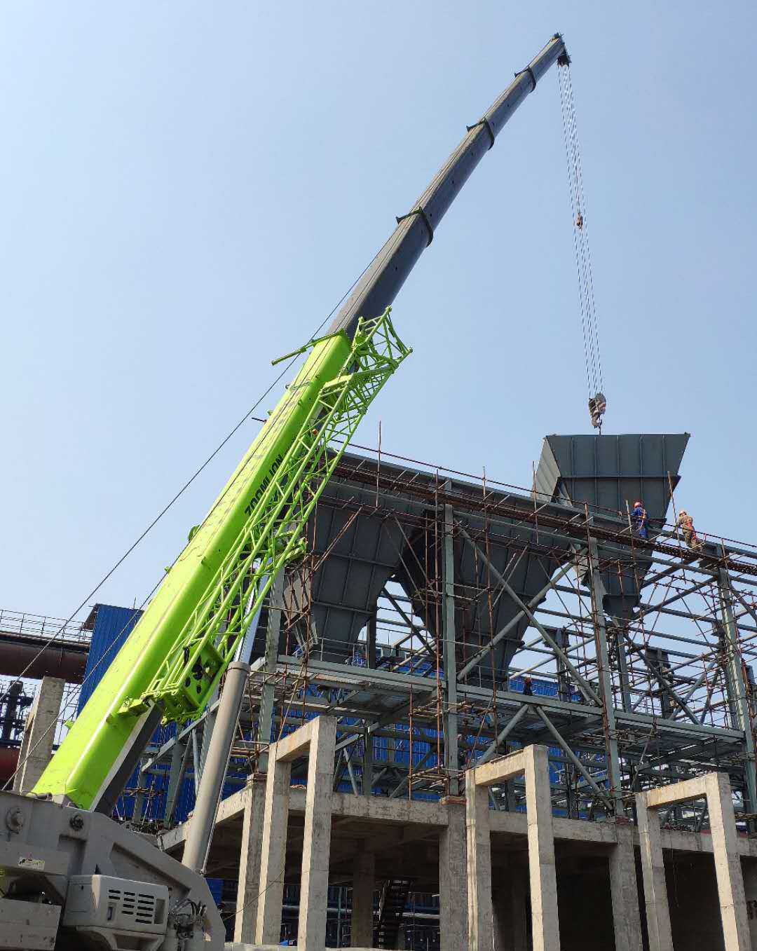 本次吊裝的反應器灰斗部分總重量達56噸,吊裝作業(yè)存在場(chǎng)地狹小、與土建單位交叉作業(yè)多、吊重荷載大等諸多困難,吊裝任務(wù)異常艱巨。為此,項目部提前合理部署,多次優(yōu)化吊裝方案,按照方案要求采用額定荷載為100噸的汽車(chē)實(shí)施吊裝作業(yè)。項目部在設備吊裝前對全體“參戰”人員進(jìn)行了現場(chǎng)安全技術(shù)交底,明確施工工序、技術(shù)要點(diǎn)難點(diǎn)和安全風(fēng)險點(diǎn),做到分工明確、責任到位,吊裝工作有條不紊地展開(kāi)。在各方力量的通力配合下,經(jīng)過(guò)六個(gè)多小時(shí)的奮戰,項目部終于完成了10臺灰斗以及現場(chǎng)輔助設備的吊裝任務(wù)。