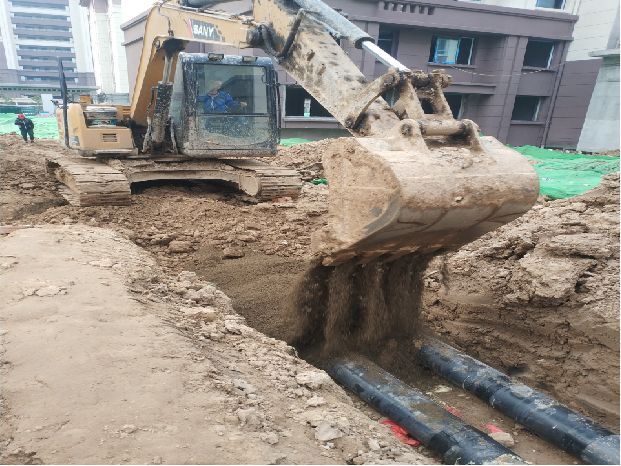漢城源筑書(shū)香苑供暖工程項目部位于江蘇省徐州市沛縣漢城源筑項目書(shū)香苑小區,施工范圍包括:書(shū)香苑熱力環(huán)網(wǎng)(一次環(huán)網(wǎng)、二次環(huán)網(wǎng))、熱交換站及自動(dòng)化控制系統(含PLC全套自控系統)、管道連接、所有與市政及單體樓棟對接檢修井等圖紙范圍內全部?jì)热?,以及與紅線(xiàn)外市政管網(wǎng)連接等;合同價(jià)1015.37萬(wàn)元。2020年8月25日正式進(jìn)場(chǎng)施工后,項目團隊嚴格按照合同施工節點(diǎn)抓生產(chǎn)、保任務(wù),尤其是10月-11月初,全體參建人員不畏艱難、逆勢而上,堅持白加黑、5+2的連續作戰模式,管理人員靠前指揮、作業(yè)人員并聯(lián)推進(jìn),只見(jiàn)挖掘機迅速掘進(jìn)、土方車(chē)來(lái)回穿梭、焊接火花四處飛濺……到處一片大干快干的繁忙景象。截至11月10日,第一階段1、2號樓室外熱力管網(wǎng)敷設任務(wù)已基本完成,比合同規定節點(diǎn)提前20天,獲得了業(yè)主單位的肯定與贊許。