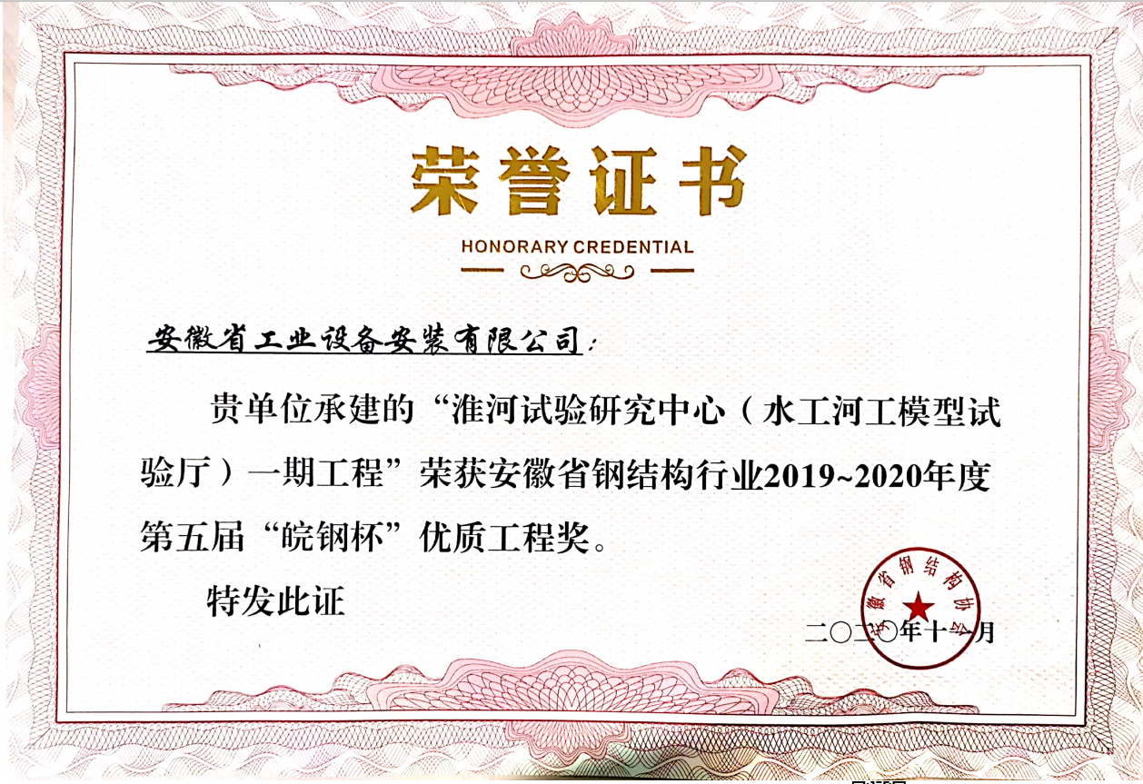 安徽安裝公司淮河試驗研究中心(水工河工模型試驗廳)一期工程榮獲“皖鋼杯”優(yōu)質(zhì)工程
