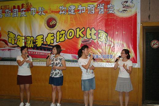 為慶祝新中國成立60周年暨傳統中秋佳節,推動(dòng)企業(yè)文化建設,9月4日下午,由公司團委、工會(huì )共同舉辦的以“喜迎國慶·中秋  構建和諧省安”為主題的青年歌手卡拉OK大賽在公司職工之家隆重舉行。來(lái)自公司機關(guān)、項目部及各分公司選派的18名選手參加了比賽。集團公司機關(guān)黨委書(shū)記宋曉英、工會(huì )女工委主任胡愛(ài)紅、人力資源部主任胡建英等應邀擔任本次比賽評委。公司領(lǐng)導及廣大職工踴躍到場(chǎng)觀(guān)看、鼓勁。