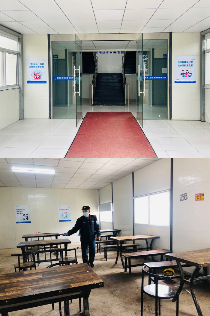 合肥潤迅數據中心項目部辦公區門(mén)口張貼防疫宣傳海報、食堂開(kāi)展衛生消殺