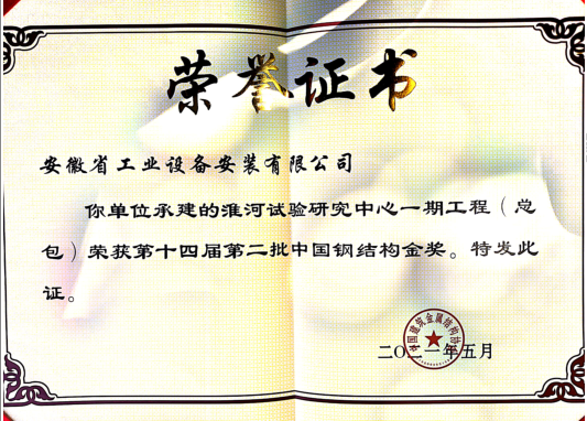 安徽安裝公司蚌埠淮河試驗研究中心一期工程榮獲“中國鋼結構金獎”