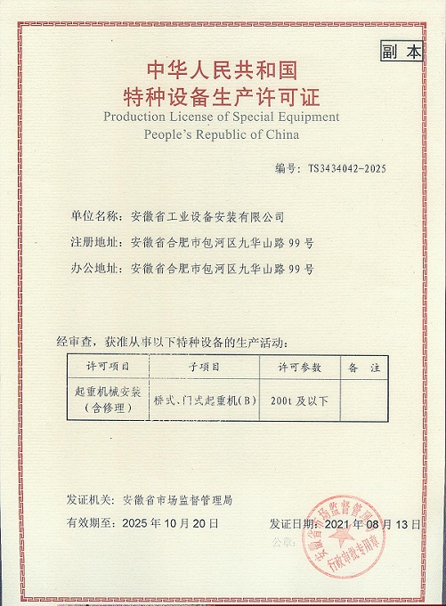 近日,安徽安裝公司起重機械制造許可證換證工作順利完成。