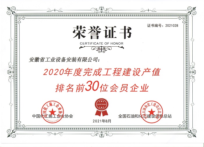 安徽省工業(yè)設備安裝有限公司榮膺中國 化工施工企業(yè)協(xié)會(huì )2020年度工程建設 產(chǎn)值排名前30位會(huì )員企業(yè)