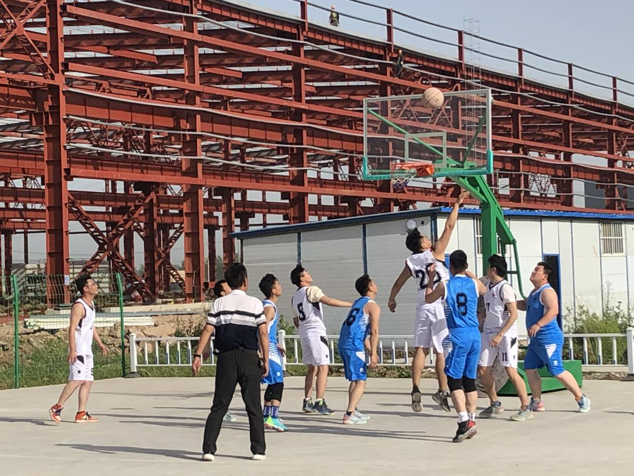 為喜迎五一,慶祝中國共產(chǎn)黨成立100周年,唱響“勞動(dòng)最光榮”的主旋律,豐富職工業(yè)余文化生活,營(yíng)造和諧向上、團結奮進(jìn)的企業(yè)文化氛圍,4月29日下午由蚌埠分公司黨支部舉辦的“迎五一 慶祝建黨100周年”職工籃球友誼賽在蚌埠臨港產(chǎn)業(yè)園項目部室外籃球場(chǎng)火熱舉行。本次籃球賽兩支球隊的隊員全部為分公司各在建項目員工,分公司班子成員和部分員工觀(guān)看現場(chǎng)比賽。