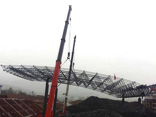 當日上午9時(shí)整,隨著(zhù)吊裝負責人一聲令下,一臺75T汽車(chē)吊作為主吊吊起鋼網(wǎng)架一端,兩臺25T汽車(chē)吊做輔吊吊起鋼網(wǎng)架另一端,50噸的大鋼網(wǎng)架徐徐升起,經(jīng)過(guò)調整、就位、固定,鋼網(wǎng)架終于穩穩地落在高高的鋼柱上,整個(gè)吊裝過(guò)程歷時(shí)不到1小時(shí)就安全完成。吊裝的科學(xué)合理安排、進(jìn)展的有序組織得到業(yè)主和監理的贊許。