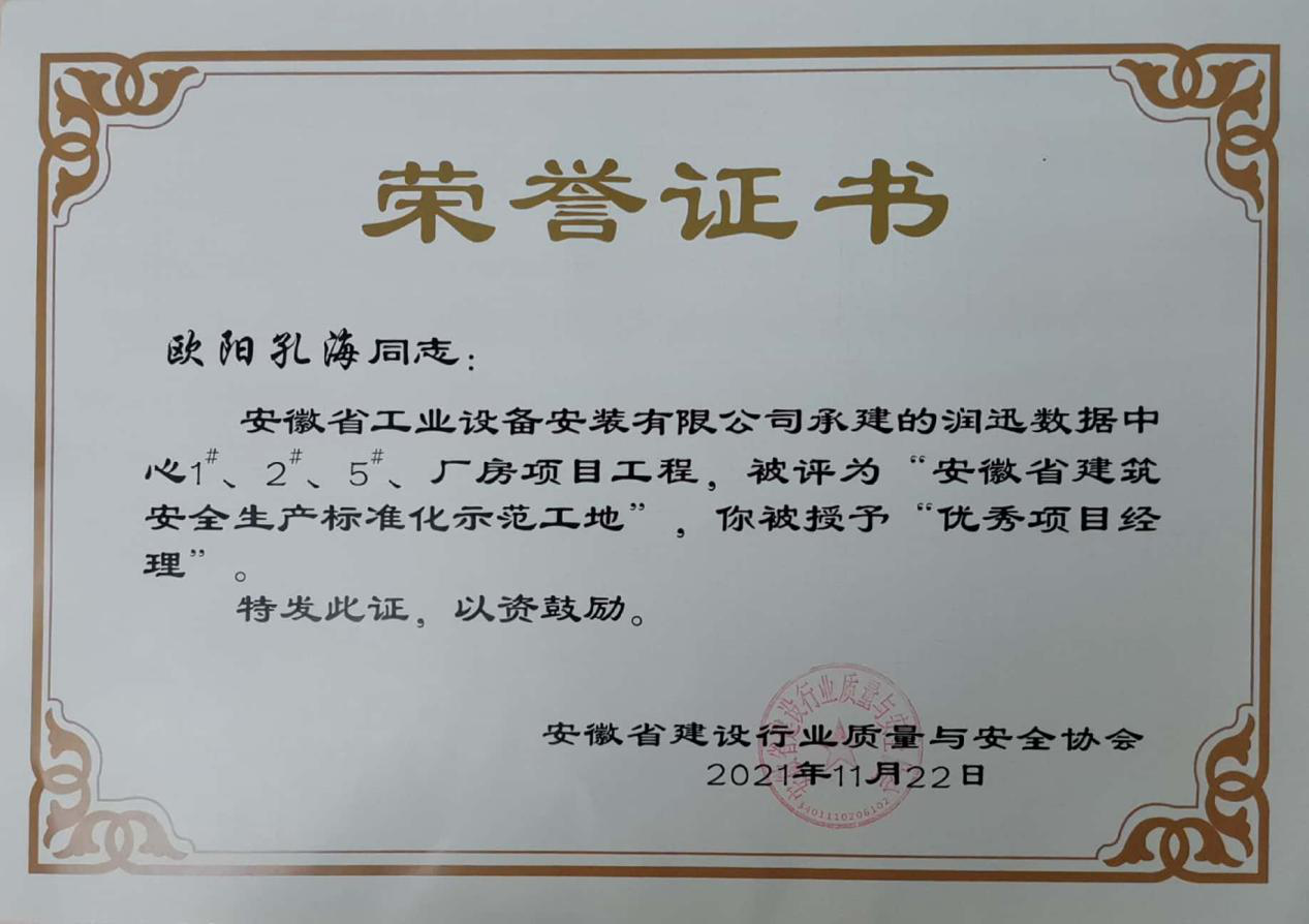 近日,安徽省工業(yè)設備安裝有限公司承建的潤迅數據中心1#、2#、5#廠(chǎng)房項目工程榮獲2021年度“安徽省建筑安全生產(chǎn)標準化示范工地”榮譽(yù)稱(chēng)號。