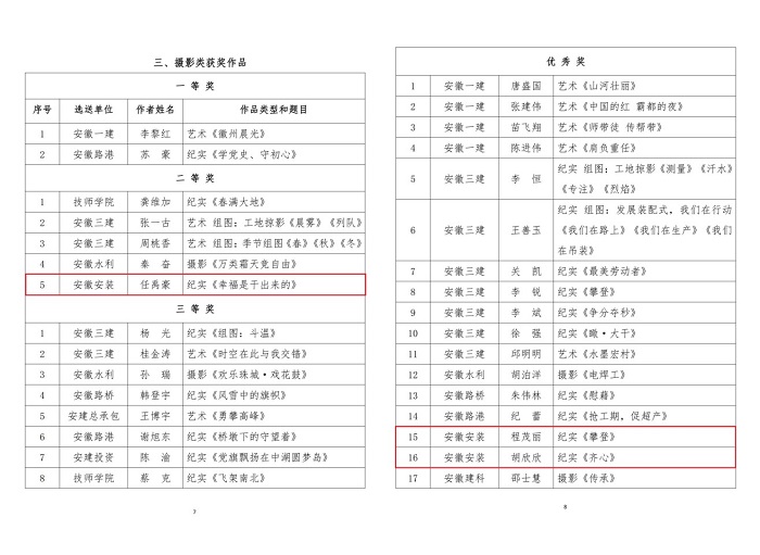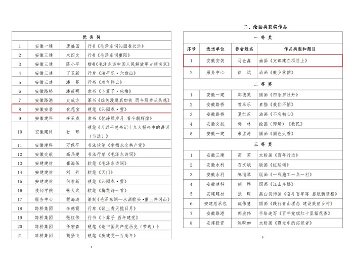 9月29日,集團公司工會(huì )通報了“翰墨寫(xiě)初心 丹青頌黨恩”職工書(shū)畫(huà)攝影作品展評選結果,安徽安裝公司選送的五幅作品榜上有名。其中馬金鑫的油畫(huà)作品《支部建在項目上》榮獲繪畫(huà)類(lèi)一等獎,任禹豪的攝影作品《幸福是干出來(lái)的》榮獲攝影類(lèi)二等獎,化范寶的硬筆書(shū)法作品《沁園春·雪》和程茂麗的攝影作品《攀登》、胡欣欣的攝影作品《齊心》分別榮獲書(shū)法類(lèi)優(yōu)秀獎和攝影類(lèi)優(yōu)秀獎。