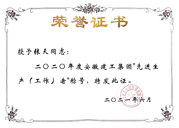 2017年5月,張天同志根據工作需要遠赴新疆烏蘇項目上,在不到兩年的時(shí)間內,嚴謹求實(shí),勤奮刻苦,兢兢業(yè)業(yè),時(shí)時(shí)處處嚴格要求自己,始終以飽滿(mǎn)的工作熱情、扎實(shí)的工作作風(fēng)、優(yōu)異的工作成績(jì),贏(yíng)得了廣大員工的普遍好評,榮獲2020年“建工集團年度先進(jìn)生產(chǎn)(工作)者”稱(chēng)號。