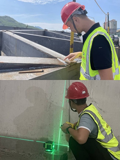 圖為岳西恒太城項目穹頂鋼結構檢查及影廳看臺放線(xiàn)場(chǎng)景