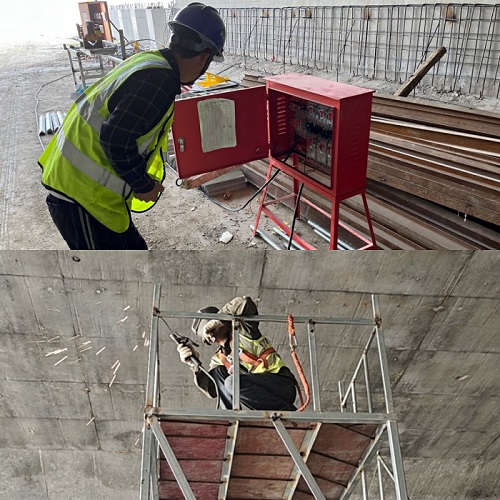 圖為花園大道道路工程項目現場(chǎng)臨時(shí)用電檢查及登高架焊接場(chǎng)景