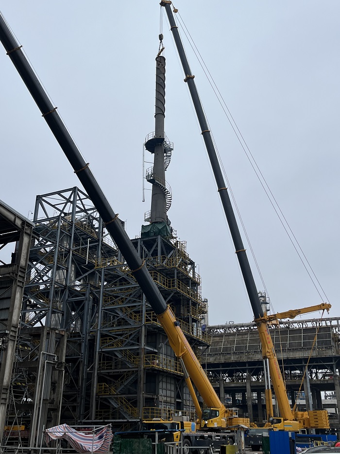 該項目原有煙囪吊耳主軸低于規范要求,存在安全隱患,因此在本次檢修期間重新制作并利用吊籠在高空焊接安裝吊耳。該煙囪及附件整體重約50噸,設備位于25米框架頂,煙囪長(cháng)35米,煙囪頂部距地面60米,受施工空間影響,采用動(dòng)態(tài)施工的組織方法,利用500T吊車(chē)主吊與130T吊車(chē)溜尾、高空組對焊接及分段吊裝等技術(shù)確保該煙囪順利吊裝。
