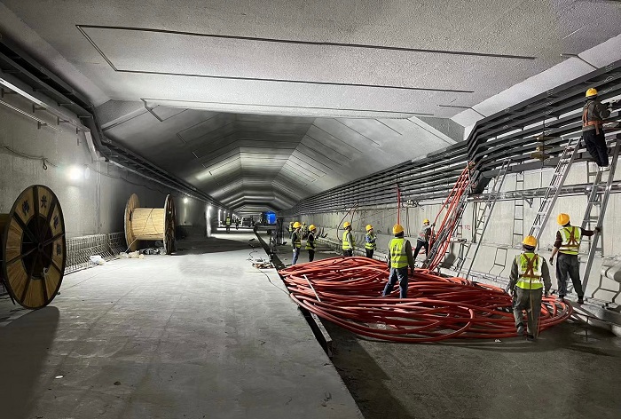 目前,項目下穿隧道東、西側1#2#配電房一次性送電成功,能夠提供隧道現場(chǎng)施工用電,東側雨水泵房和中間廢水泵房已完成施工任務(wù),隧道里的橋架安裝、電纜敷設、消防水管安裝、照明燈具安裝及各附屬設施安裝建設也正在加速進(jìn)行當中。
