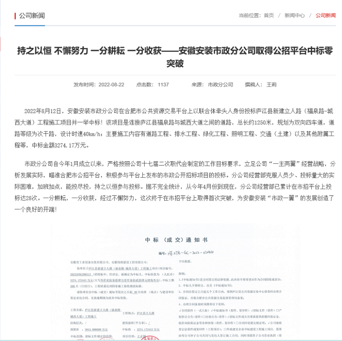公司網(wǎng)站上刊登的中標宣傳報道
