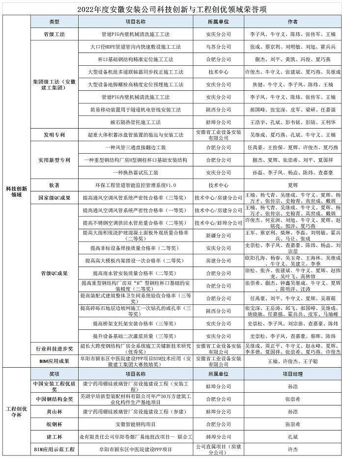 近日,安徽安裝公司對2022年度科技創(chuàng )新與工程創(chuàng )優(yōu)領(lǐng)域榮譽(yù)進(jìn)行了表彰獎勵,這也是公司連續多年來(lái)為充分調動(dòng)和激勵科技創(chuàng )新和工程創(chuàng )優(yōu)積極性,進(jìn)一步加強和促進(jìn)工程創(chuàng )優(yōu)及科技進(jìn)步的一項重要工作。