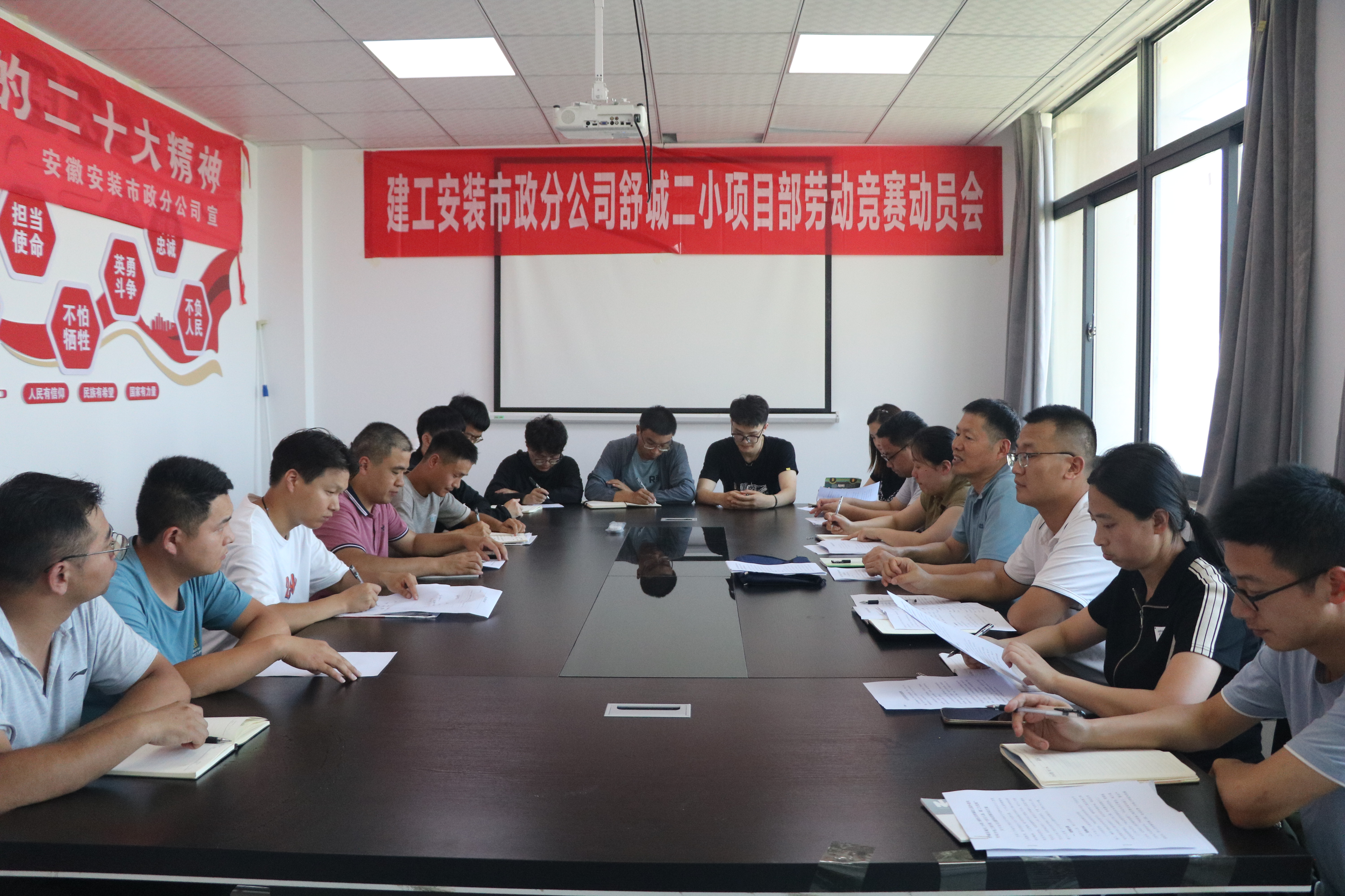 7月10日上午,市政分公司舒城縣城關(guān)二小緯二路校區及附屬幼兒園項目部舉行勞動(dòng)競賽動(dòng)員會(huì ),并組織開(kāi)展勞動(dòng)競賽大討論,正式拉開(kāi)項目部“當好主人翁,建功大發(fā)展”大干20天,全面完成室外強電專(zhuān)業(yè)分包工程施工任務(wù)主題勞動(dòng)競賽活動(dòng)序幕。分公司黨支部書(shū)記胡迎東、副經(jīng)理解保及分公司勞動(dòng)競賽領(lǐng)導小組成員出席會(huì )議,項目部全體管理人員及施工班組代表參會(huì )。會(huì )議由分公司工會(huì )副主席張曼主持。