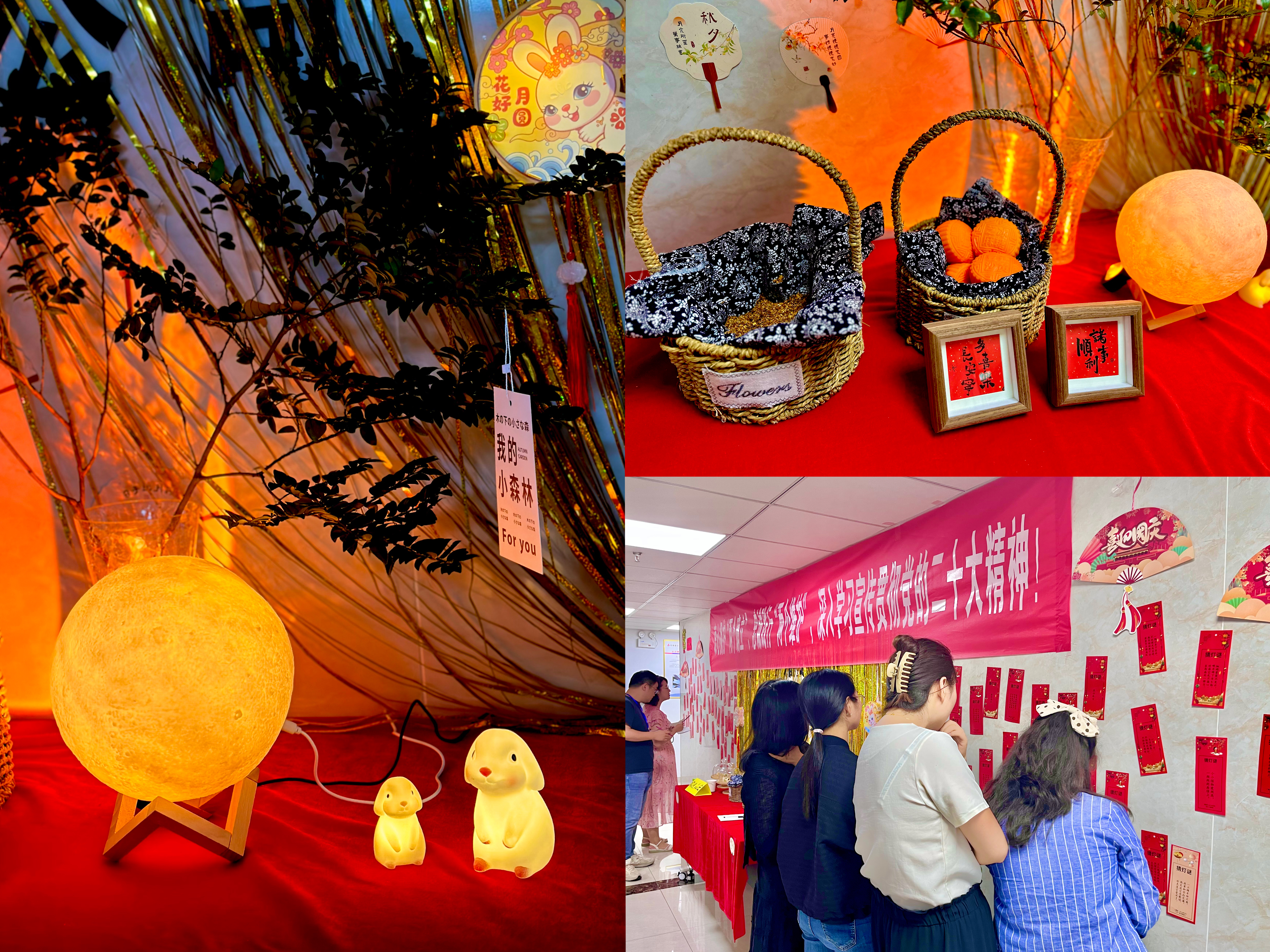 分公司工會(huì )購置月亮燈、玉桂兔、綠植、桂花籃、燈籠、貼畫(huà)等各種裝飾物,把整個(gè)分公司裝扮得喜慶又熱鬧,擺放各式月餅、綠豆糕等供大家品嘗。舉辦“猜燈謎”小游戲,在分公司背景墻貼上“燈謎”小卡片,大家紛紛駐足觀(guān)賞、熱情參與,節日氣氛值瞬間拉滿(mǎn)。