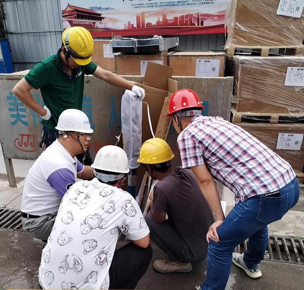 安徽大學(xué)綠色產(chǎn)業(yè)創(chuàng )新基地項目現場(chǎng)安裝人員正在進(jìn)行電梯開(kāi)箱檢驗
