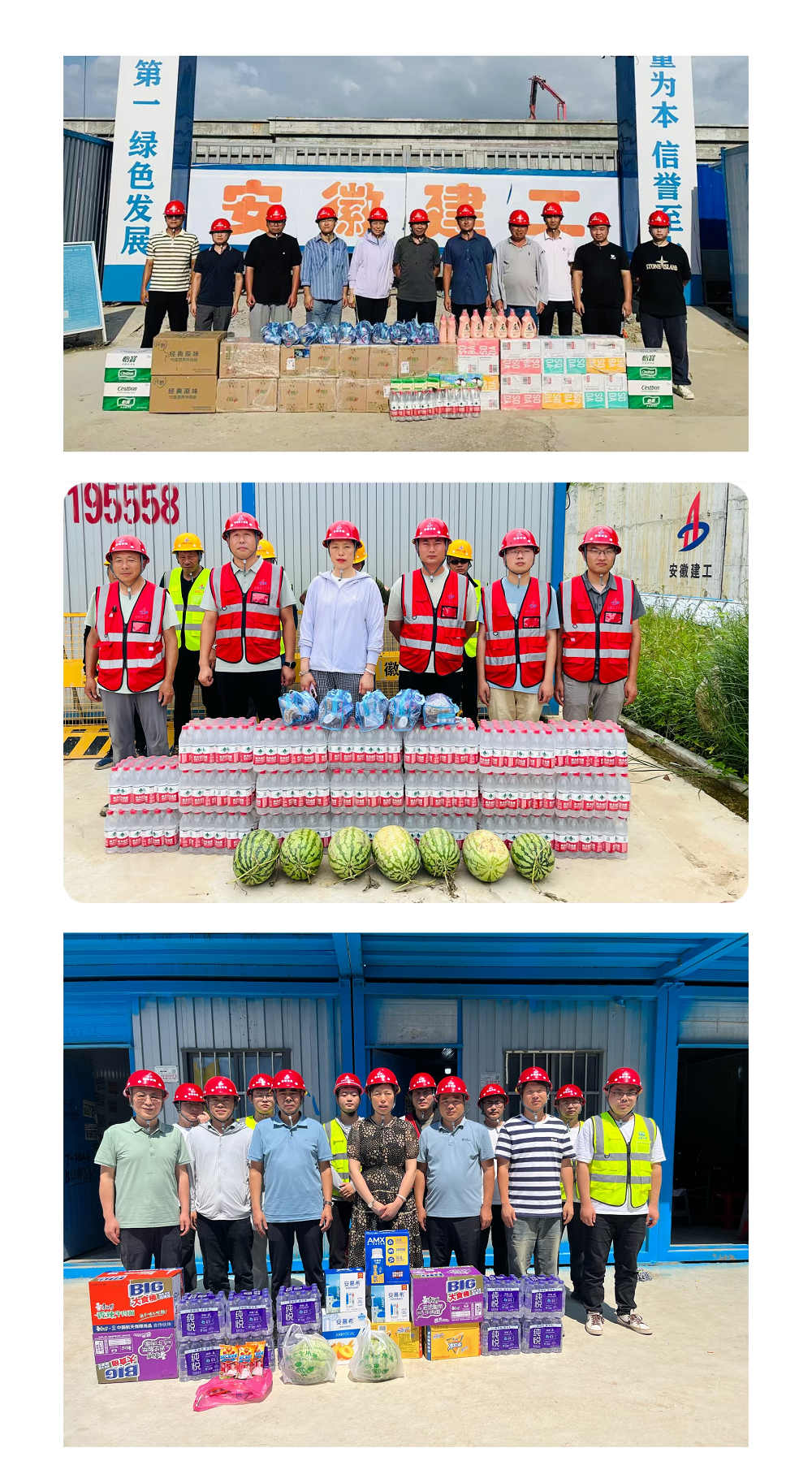 此次慰問(wèn)先后來(lái)到新橋智能制造產(chǎn)業(yè)園、合肥七水廠(chǎng)、阜南第一小學(xué)、阜南污水廠(chǎng)等項目一線(xiàn),將礦泉水、酸奶、綠豆、毛巾、十滴水、清涼油、風(fēng)油精等防暑降溫物資送到一線(xiàn)職工的手中。慰問(wèn)組一行與職工親切交談,感謝他們烈日下的堅守,叮囑他們要注意休息,勞逸結合,高溫作業(yè)時(shí)要注意安全、做好防暑降溫,保證安全工作與自身健康。