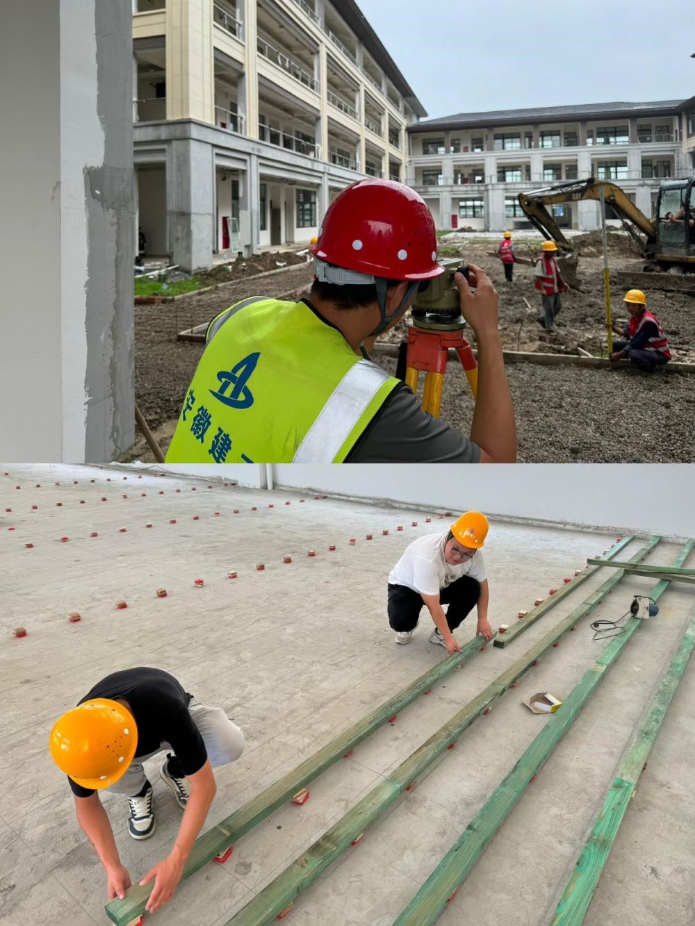 圖為4號樓內庭院鋪裝基層碎石整平、室內體育場(chǎng)運動(dòng)木地板龍骨搭建