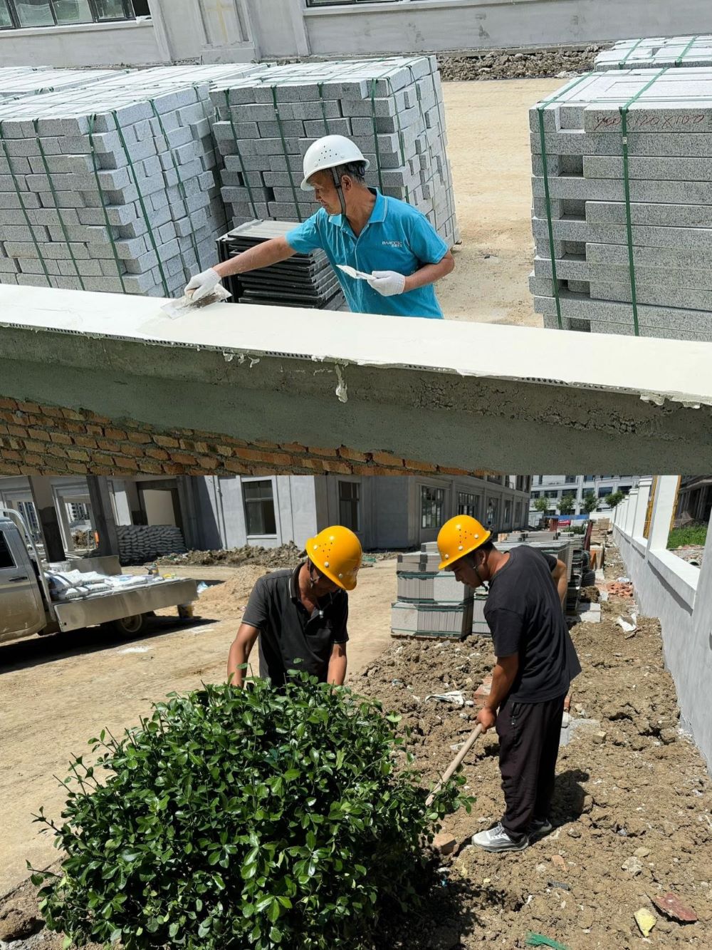 圖為圍墻披膩子、室外綠化種植