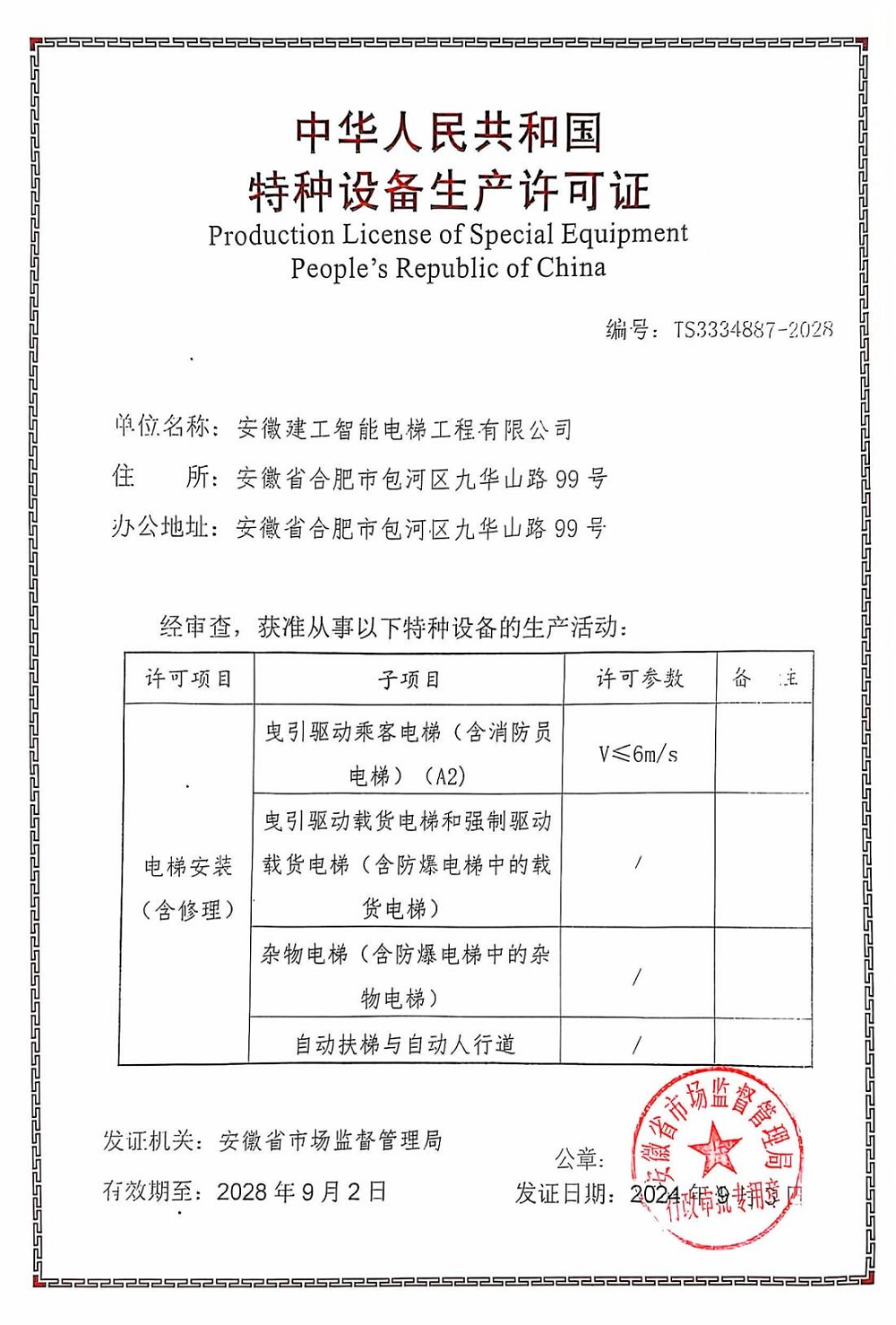 近日,經(jīng)安徽省市場(chǎng)監督管理局核準,安徽建工智能電梯工程有限公司順利取得特種設備生產(chǎn)許可證,喜獲電梯安裝(含修理)A2級資質(zhì)。