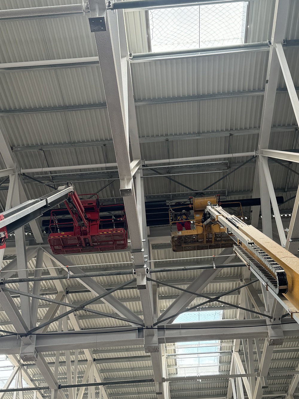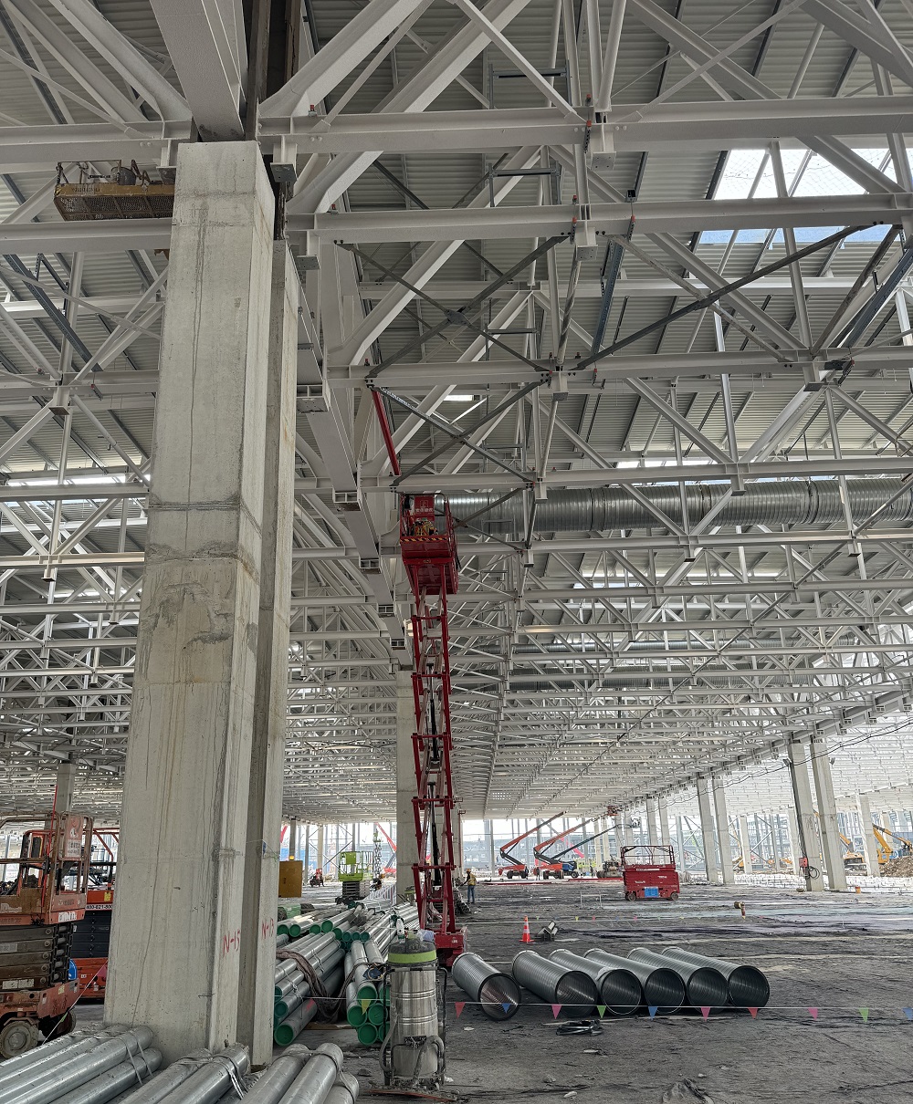 目前正在進(jìn)行車(chē)間一1-6區通風(fēng)管、照明管、橋架、虹吸雨水管、衛生間排水管、防雷接地、消防管等安裝作業(yè),材料加工區預制各類(lèi)管道支架也在同步推進(jìn)?,F已完成車(chē)間一風(fēng)管安裝約3000平方米,風(fēng)管預制約8000平方米,虹吸雨水管道安裝約120米,照明配管安裝約2000米,消防管道安裝約320米,防雷接地網(wǎng)安裝約10000米,橋架安裝約400米。
